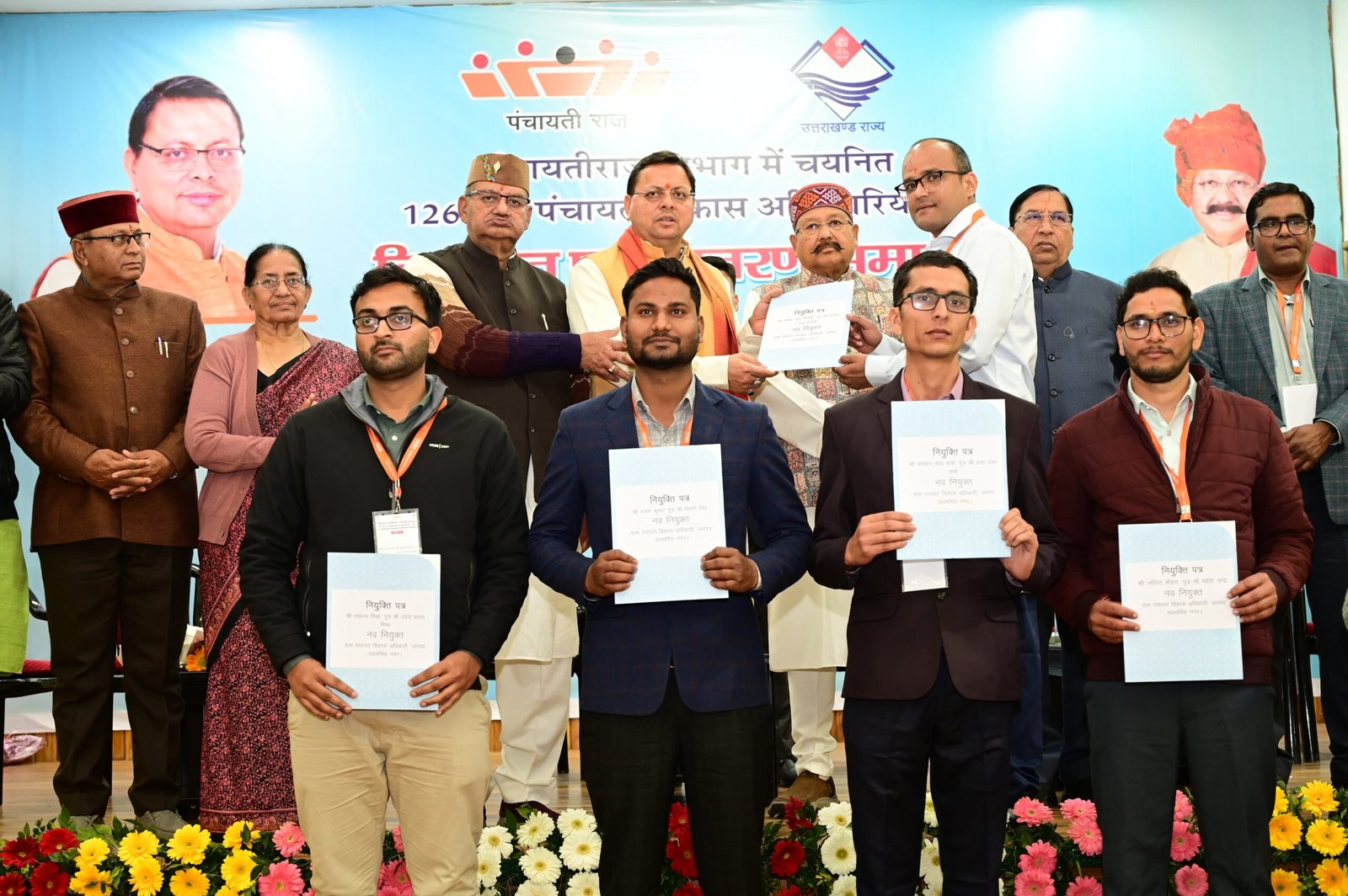 देहरादून। मुख्यमंत्री पुष्कर सिंह धामी ने पंचायतीराज विभाग के अन्तर्गत 126 नवनियुक्त ग्राम पंचायत विकास अधिकारियों को नियुक्ति पत्र प्रदान किये। पिछले साढ़े तीन सालों में राज्य में 20 हजार से अधिक युवाओं को सरकारी सेवाओं में नौकरी प्रदान की गई है। मुख्यमंत्री ने सभी अभ्यर्थियों को शुभकामनाएं देते हुए कहा कि यह दिन आपके जीवन में एक नया अध्याय लेकर आया है। उन्होंने आशा व्यक्त करते हुए कहा नव चयनित अभ्यर्थी लोकतंत्र की सबसे महत्वपूर्ण इकाई ग्राम पंचायत के अभिन्न अंग बनकर गाँवों का समग्र विकास सुनिश्चित करने की दिशा में कार्य करेंगे। राज्य के समग्र विकास के लिए गांवों का विकास जरूरी है। गांवों के विकास में एक ग्राम पंचायत विकास अधिकारी की भूमिका अत्यंत महत्वपूर्ण होती है। मुख्यमंत्री ने कहा कि राज्य में देश का सबसे सख्त नकल विरोधी कानून लागू किया गया है। इस कानून में सजा और जुर्माने के कठोर प्राविधान किये गए हैं। जब मेहनती और ईमानदार व्यक्ति अपनी लगन और मेहनत के दम पर कोई पद प्राप्त करता है, तो वह आम लोगों की पीड़ा और समस्याओं को समझकर ईमानदारी से अपना काम करता है। उन्होंने कहा कि राज्य सरकार उत्तराखंड को देश का अग्रणी राज्य बनाने के उद्देश्य से शहरों के साथ गाँवों के विकास पर भी प्राथमिकता के साथ कार्य कर रही है। राज्य में सख्त भू-कानून के लिए विधानसभा में विधेयक पारित हो चुका है। मुख्यमंत्री ने कहा कि उत्तराखण्ड के निर्माण का सपना हमारे आन्दोलनकारियों ने इसलिए देखा था कि उत्तराखण्ड के अंतिम छोर में खड़े हुए व्यक्ति तक विकास पहुंचे। सभी उत्तराखण्डवासी मिल जुलकर राज्य को आगे बढ़ायें। मुख्यमंत्री ने सभी उत्तराखण्ड वासियों से आग्रह किया कि किसी भी प्रकार के बहकावे में न आकर एक उत्तराखण्ड की भावना से मिलकर कार्य करें। उन्होंने सख्त लहजे में कहा कि चाहे वे कोई भी हों, मंत्री हों, विधायक हों, सांसद हों या कोई आम उत्तराखंडी ही क्यों न हों, उत्तराखंड की एकता के साथ खिलवाड़ करने वालों को सरकार माफ नहीं करेगी। आज के बाद सभी प्रकार के भड़काऊ बयानों को गंभीरता से लिया जाएगा और उत्तराखंड की अस्मिता से खिलवाड़ करने वालों पर सख्त कार्यवाही सुनिश्चित की जाएगी। पंचायतीराज मंत्री सतपाल महाराज ने सभी नवचयनित ग्राम पंचायत विकास अधिकारियों को शुभकामनाएं देते हुए कहा कि प्रदेश में डबल इंजन की सरकार द्वारा प्रदेश के सर्वांगीण विकास के लिए अनेक योजनाएं चलाई जा रही हैं। जनवरी 2025 में समान नागरिक संहिता लागू कर उत्तराखण्ड यह कानून लागू करने वाला देश का पहला राज्य बना है। पंचायतीराज विभाग द्वारा ग्राम पंचायतों में अवस्थापना सुविधाओं के तहत पंचायत भवनों का निर्माण, अतिरिक्त कक्षों 